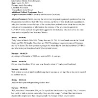 En este encuentro el entrevistado responde preguntas de carácter personal acerca de cómo la pandemia ha afectado su vida, sus costumbres, las de su familia y conocidos. También se aborda el tema de la vacuna, los miedos y desconocimientos acerca de la misma, el consumo de información, la respuesta del gobierno ante la crisis del Covid-19 y sus pensamientos y sugerencias para el futuro. El entrevistado es un trabajador rural en un rancho oriundo de Veracruz, México.