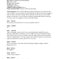 Esta es una entrevista de seguimiento luego de que el entrevistado recibió la primera dosis de la vacuna contra el Covid-19. Se realizan preguntas acerca de los efectos secundarios de la vacuna, los cambios en su vida cotidiana y sus sentimientos luego de recibir la vacuna, las actitudes de su jefe y compañeros de trabajo, la opinión que tiene acerca de la campaña de vacunación que lleva adelante el estado de Wisconsin, y sus sugerencias para el futuro de la clínica.
