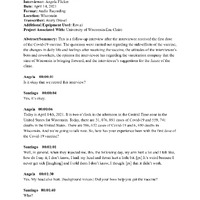 Esta es una entrevista de seguimiento luego de que el entrevistado recibió la primera dosis de la vacuna contra el Covid-19. Se realizan preguntas acerca de los efectos secundarios de la vacuna, los cambios en su vida cotidiana y sus sentimientos luego de recibir la vacuna, las actitudes de su jefe y compañeros de trabajo, la opinión que tiene acerca de la campaña de vacunación que lleva adelante el estado de Wisconsin, y sus sugerencias para el futuro de la clínica.